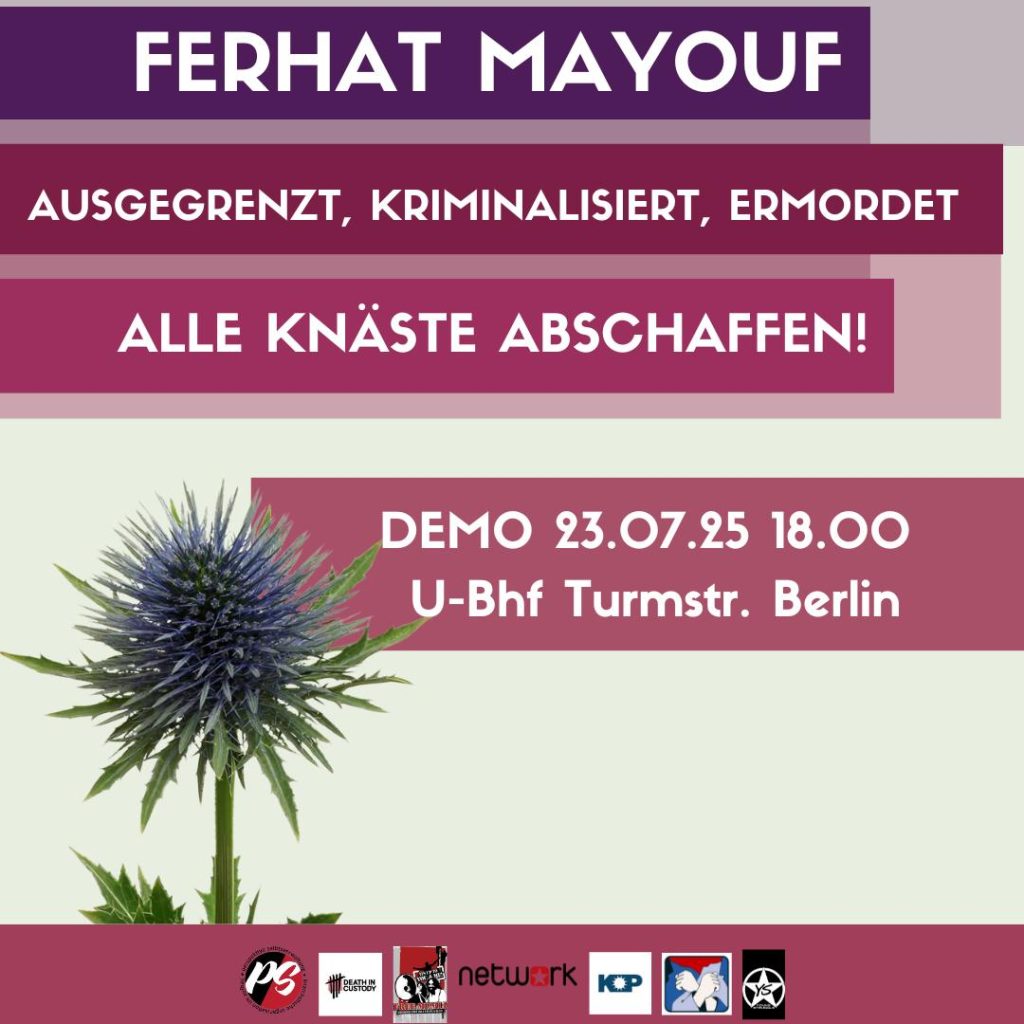 Gemeinsam mit den Genoss:innen von Death in Custody, KOP Berlin, Free Mumia Berlin, Perspektive Selbstverwaltung, Young Struggle, dem Netzwerk Freiheit für alle politischen Gefangenen Berlin rufen wir als Rote Hilfe Berlin zur kommenden Demo auf, in Gedenken an Ferhat Mayouf. Wir teilen hier den gemeinsamen Aufruf.