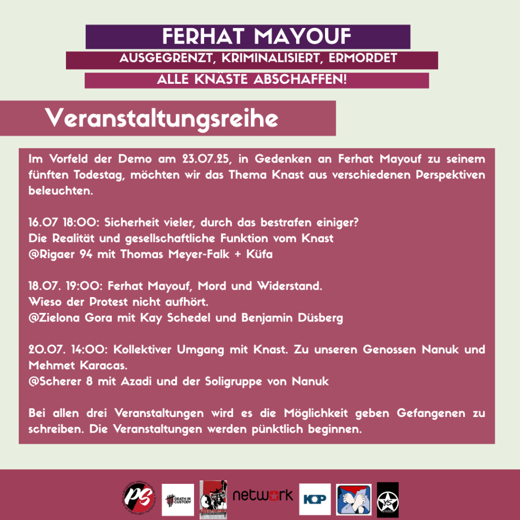 Drei Veranstaltungen zum Thema Knast vor der Demo am 23.07.25 in Gedenken an Ferhat Mayouf