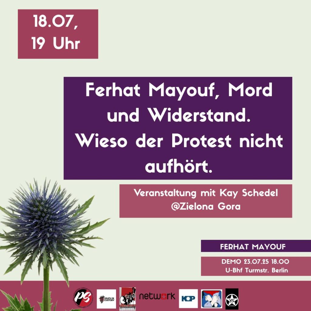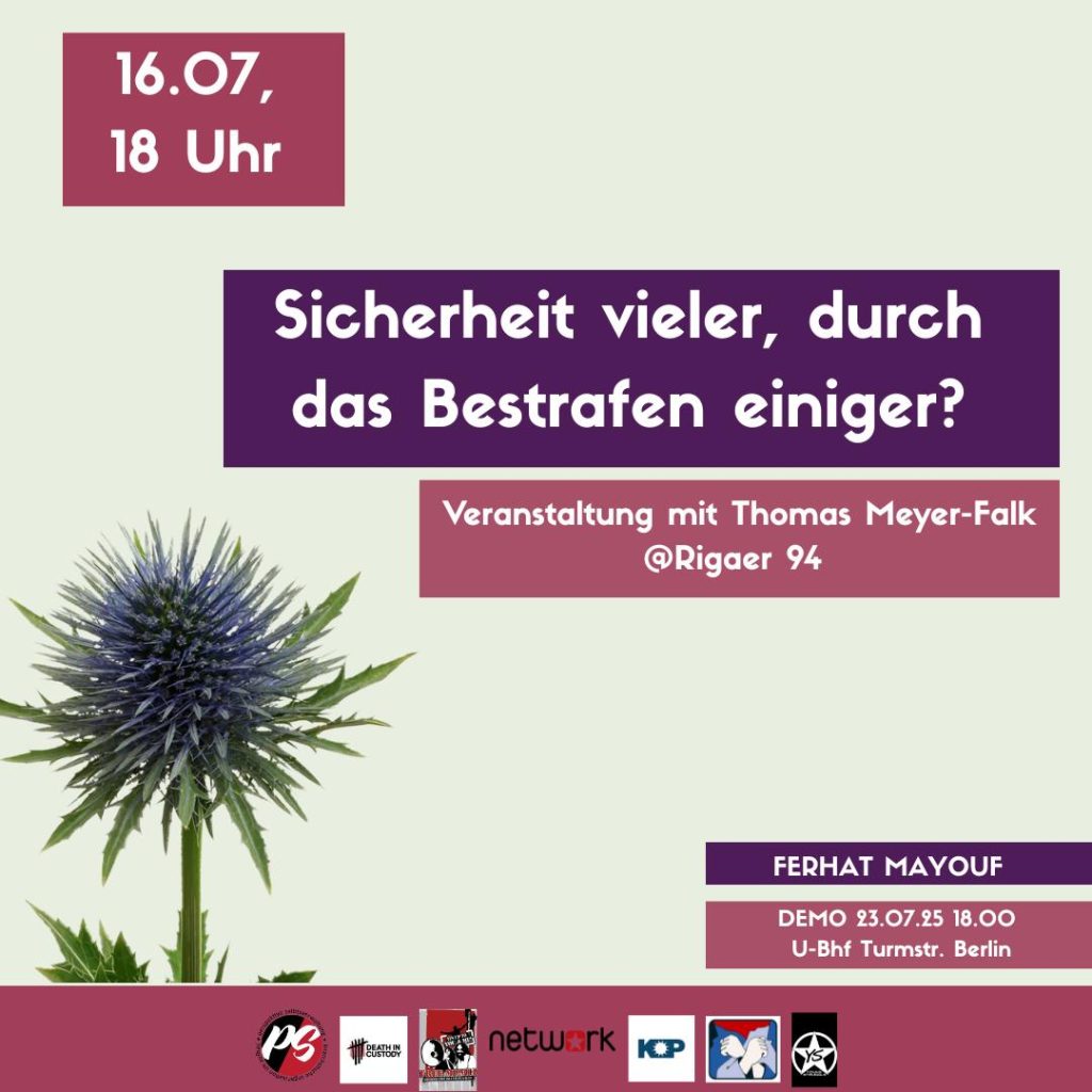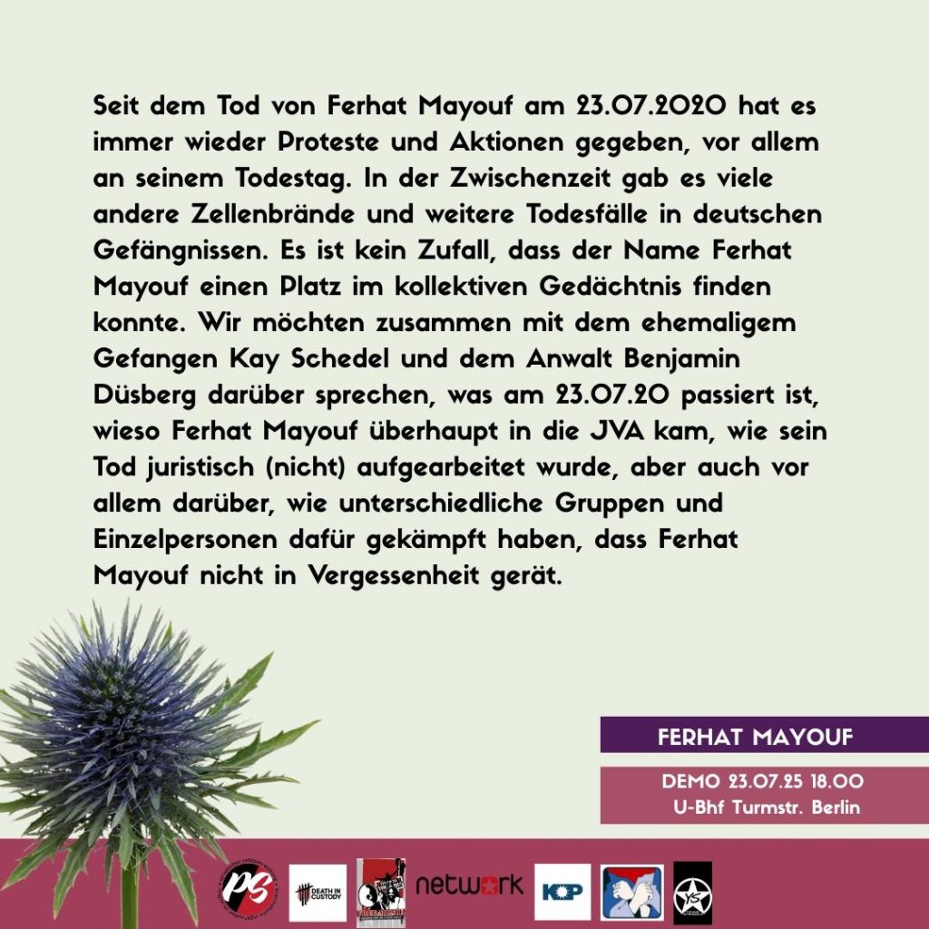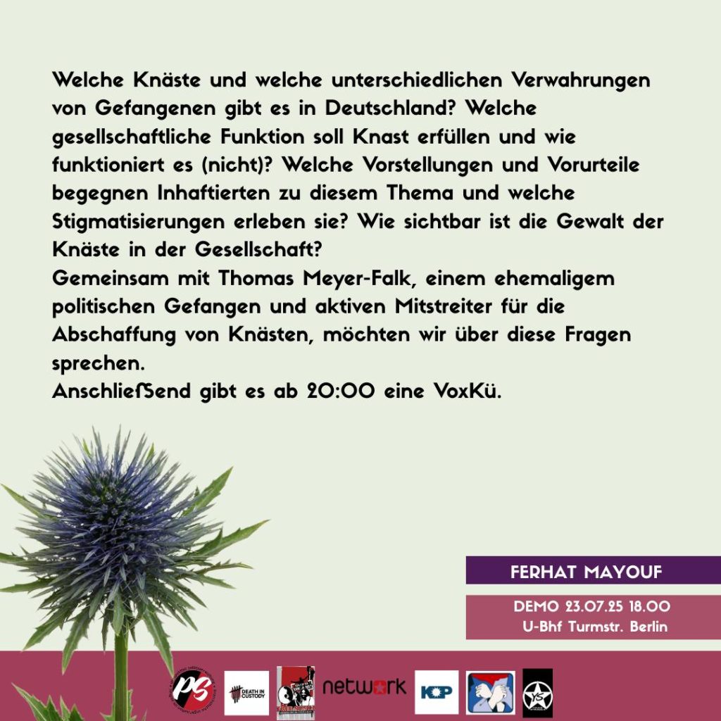 Im Vorfeld der Demo am 23.07.25, in Gedenken an Ferhat Mayouf zu seinem fünften Todestag, möchten wir das Thema Knast aus verschiedenen Perspektiven beleuchten.