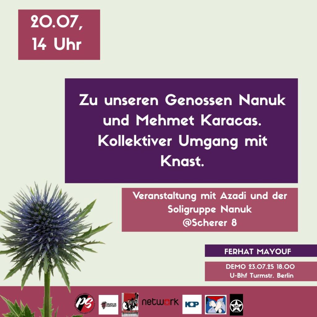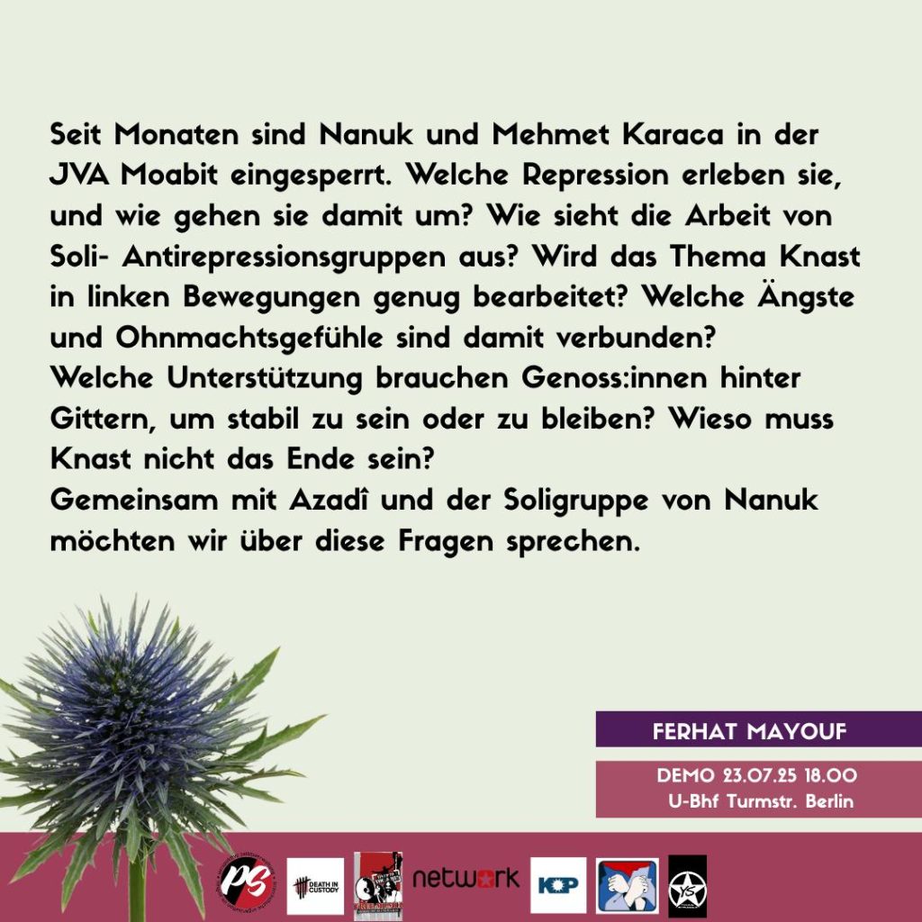 Seit Monaten sind Nanuk und Mehmet Karaca in der JVA Moabit eingesperrt. Welche Repression erleben sie, und wie gehen sie damit um? Wie sieht die Arbeit von Soli- Antirepressionsgruppen aus? Wird das Thema Knast in linken Bewegungen genug bearbeitet? Welche Ängste und Ohnmachtsgefühle sind damit verbunden? Welche Unterstützung brauchen Genoss:innen hinter Gittern, um stabil zu sein oder zu bleiben? Wieso muss Knast nicht das Ende sein? Gemeinsam mit Azadî und der Soligruppe von Nanuk möchten wir über diese Fragen sprechen.